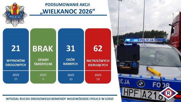 Komenda Wojewódzka Policji w Łodzi poinformowała, że w dniach od trzeciego do szóstego kwietnia wydarzyło się 21 wypadków drogowych, w których zostało rannych 31 osób. Na szczęście tym razem obyło się bez ofiar śmiertelnych. Jest to poprawa w porównaniu z analogicznym okresem roku 2025, kiedy to wydarzyło się 25 wypadków, w których poniosły śmierć 4 osoby.
