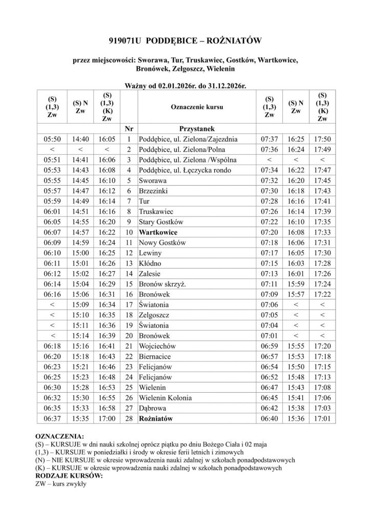 Nowe połączenie obejmuje Poddębice, Sworawę, Tur, Truskawiec, Gostków, Wartkowice, Felicjanów, Bronówek, Zelgoszcz, Wielenin i Rożniatów.